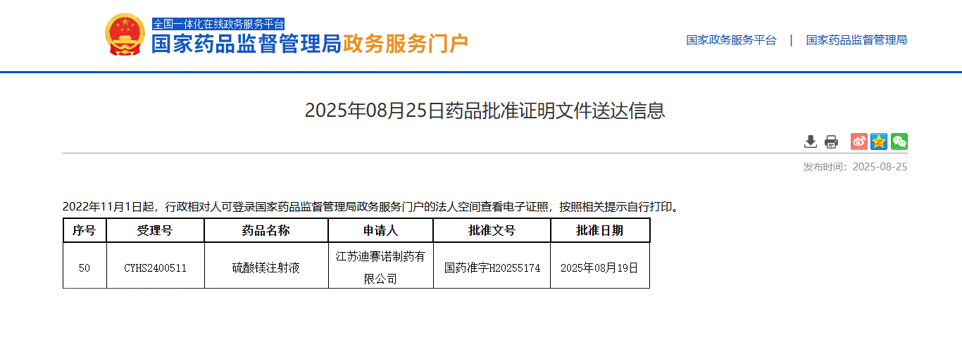 近日,九州在线收到国家药品监督管理局签发的硫酸镁注射液获批信息通知,并在国家药品监督管理局政务服务门户平台公示。